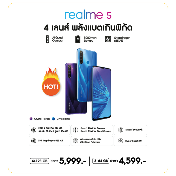 เมื่อซื้อ realme 5 "4 เลนส์ พลังแบตเกินพิกัด" ราคาเริ่มต้นที่ 4,599 บาท รับทันทีการรับประกันตัวเครื่องนาน 24 เดือน และสิทธิ์การผ่อนชำระทางบัตรเครดิตที่ร่วมรายการ 0% นาน 6 เดือน