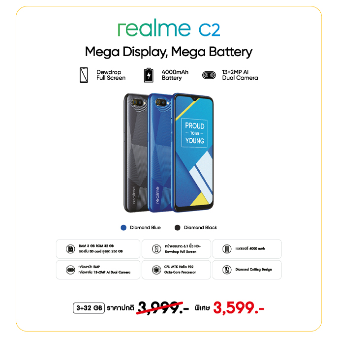 เมื่อซื้อ realme C2 "Mega Display, Mega Battery" ในราคาพิเศษเพียง 3,599 บาท จากราคาปกติ 3,999 บาท รับทันทีการรับประกันตัวเครื่องนาน 24 เดือน และสิทธิ์การผ่อนชำระทางบัตรเครดิตที่ร่วมรายการ 0% นาน 6 เดือน