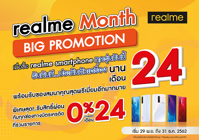 โปรส่งท้ายปี realme Month Big Promotion มอบประกัน 24 เดือน ผ่อน 0% 24 เดือน พร้อมของแถมเพียบ