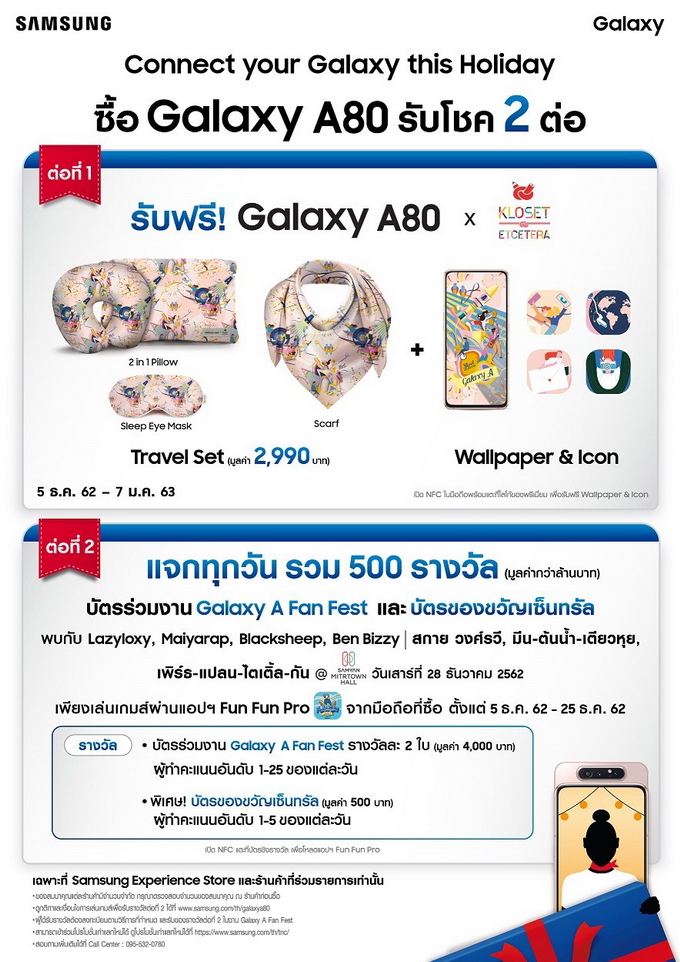 พบกับไฮไลท์สุดพิเศษ เมื่อซื้อสมาร์ทโฟน Samsung Galaxy A80 รับทันที Travel Set สุดพิเศษจาก Kloset and Etcetera แบรนด์แฟชั่นสัญชาติไทยชื่อดัง ประกอบด้วย 2in1 Pillow, Sleep Eye Mask และผ้าพันคอพิมพ์ลายอันเป็นเอกลักษณ์ของแบรนด์ลายลิมิเต็ด หรือเมื่อซื้อ Samsung Galaxy A50s รับไปเลย Buddy Bag สุดเท่ห์ ฝีมือการออกแบบของ Benzilla ศิลปินแนวสตรีทชื่อดัง อีกทั้งยังมาพร้อมกับวอลเปเปอร์ และ icon ลายลิมิเต็ดทั้ง 2 รุ่น