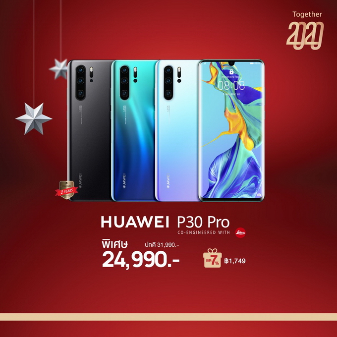 Swarovski มูลค่า 2,990 บาท, HUAWEI P30 Pro ราคา 24,990 บาท (ลดเพิ่มทันทีอีก 1,749 บาท) และ HUAWEI P30 ในราคา 15,990 บาท (ลดเพิ่มทันทีอีก 1,119 บาท)