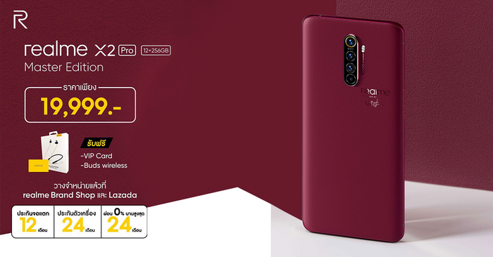พิเศษสุด realme X2 Pro Master Edition สีอิฐแดง Brick Red จะวางจำหน่ายในเราเดิมครับ เพียง 19,999 บาท เท่านั้น พร้อมของแถม realme Buds wireless, VIP card ประกันจอแตก 1 ปี (เฉพาะซื้อที่ realme Brand shop เท่านั้น) และสำหรับคนที่ซื้อ realme X2 Pro Master Edition ก่อนวันที่ 31 ธันวาคมนี้ รับเพิ่ม! ประกันตัวเครื่องยาวนาน 24 เดือน และสิทธิ์ผ่อน 0% นานสูงสุด 24 เดือน ที่ realme Brand shop และ Lazada