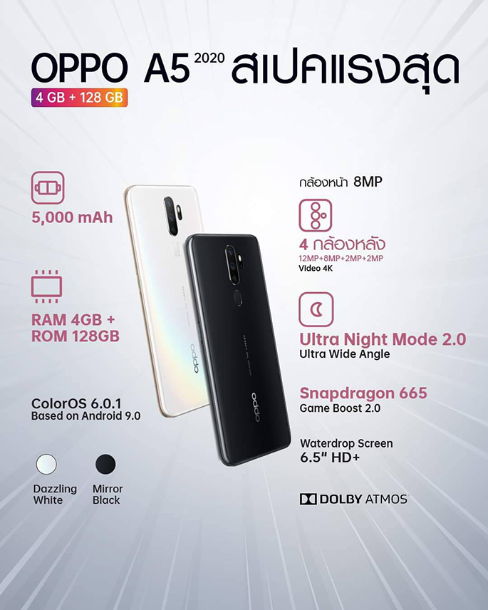 OPPO A5 2020 4GB มาพร้อมกับกล้องหลัง 4 ตัว ความละเอียดสูงสุด 12MP สามารถเก็บภาพมุมกว้างได้ถึง 119 องศา ด้วย Ultra Wide Angle และถ่ายภาพได้อย่างคมชัดแม้ในที่แสงน้อยด้วย Ultra Night Mode 2.0 พร้อมมอบประสบการณ์การใช้งานที่ลื่นไหลด้วยชิปเซ็ต Snapdragon 665, RAM 4GB + ROM 128GB อีกทั้งใช้งานได้ยาวนานตลอดทั้งวันด้วยแบตเตอรี่ 5,000 mAh โดยสามารถชาร์จให้เครื่องอื่นได้ด้วยฟีเจอร์ Reverse Charging นอกจากนี้ยังมาพร้อมกับลำโพงสเตอริโอคู่และระบบเสียง Dolby Atmos ที่เป็นระบบเสียงเดียวกันกับโรงภาพยนตร์ระดับไฮคลาส เข้ามาเพิ่มความกระหึ่ม ความหนักแน่น เสมือนพกโรงภาพยนตร์ติดตัว