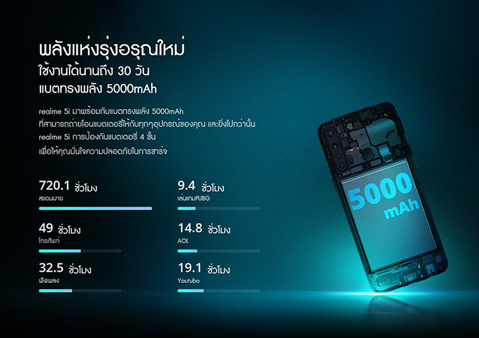 realme 5 Series ที่มาพร้อมกับแบตเตอรี่ความจุสูงถึง 5,000 mAh รองรับการใช้งานได้นานถึง 30 วัน พร้อมสนุกมากยิ่งขึ้นด้วยกล้องหลัง AI 4 เลนส์ และดีไซน์ฝาหลังแบบใหม่ด้วยสไตล์ที่เป็นเอกลักษณ์