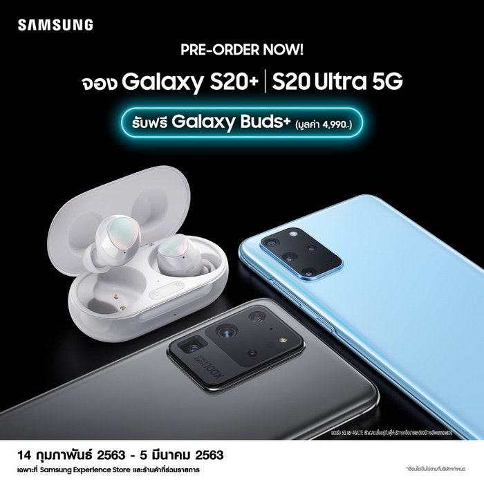 จอง Samsung Galaxy S20+ และ Samsung Galaxy S20 Ultra ตั้งแต่วันนี้ - 5 มีนาคม 2563 รับฟรีทันทีหูฟังไร้สายรุ่นล่าสุด Samsung Galaxy Buds+ มูลค่า 4,990 บาท