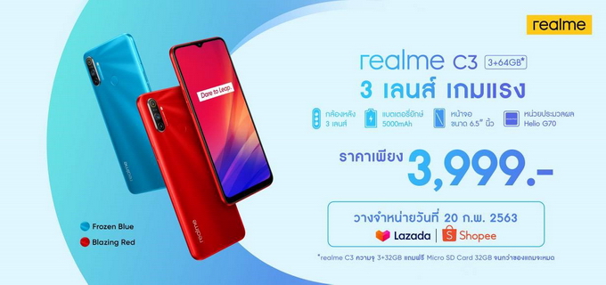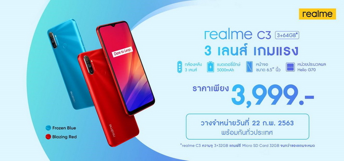 realme C3 มีให้เลือก 2 สี ได้แก่ Blazing Red และ Frozen Blue ความจุ 3GB+32GB พร้อมโปรโมชั่นพิเศษ แถม Micro SD ความจุ 32 GB รวมกันแล้วจะได้พื้นที่ความจุถึง 64GB ในราคาเพียง 3,999 บาท วางจำหน่ายในวันที่ 22 กุมภาพันธ์นี้ ที่ realme Brand Shop และตัวแทนจำหน่ายทั่วประเทศ