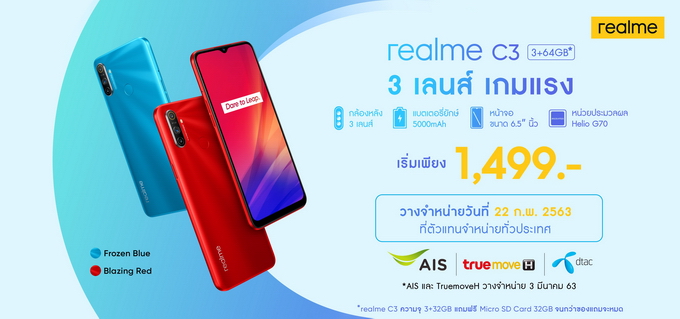พิเศษสำหรับลูกค้า DTAC เป็นเจ้าของ realme C3 ได้ในราคาเริ่มต้นเพียง 1,599 บาท ในวันที่ 22 กุมภาพันธ์นี้และสำหรับลูกค้า AIS, TrueMove H เป็นเจ้าของ realme C3 ในราคาเริ่มต้นเพียง 1,499 บาท ในวันที่ 3 มีนาคมนี้