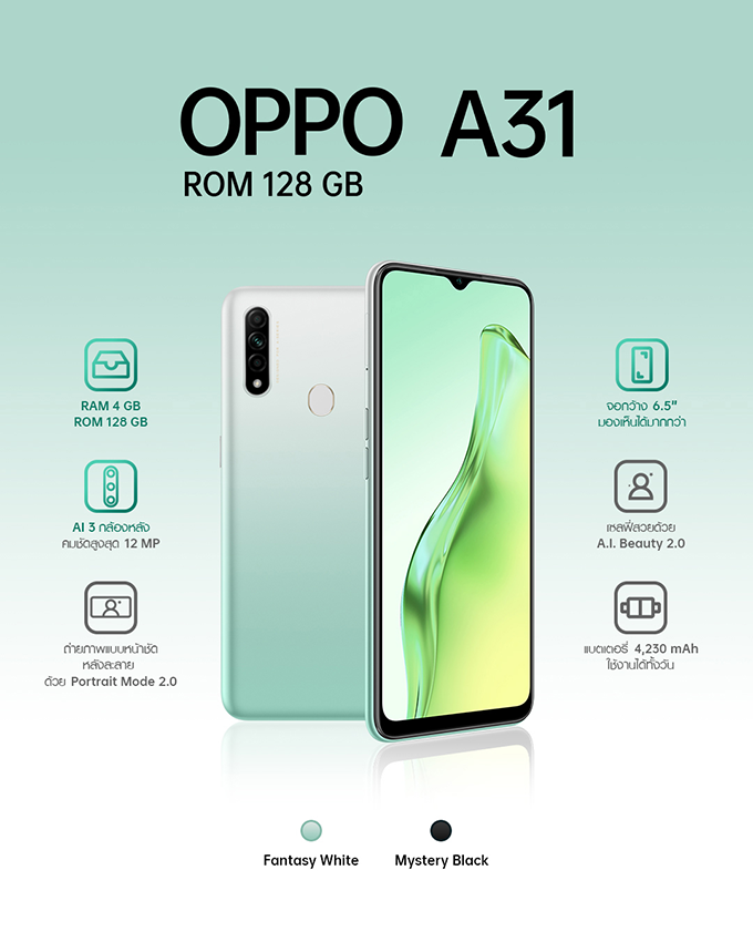 พร้อมทั้งดีไซน์ฝาหลังแบบ 3D อันโดดเด่นที่มาพร้อมสี Fantasy White ที่นำแรงบันดาลใจมากจากกระเบื้องเคลือบของ Ru Ware ซึ่งเป็นเครื่องคลือบที่มีชื่อเสียงและหายากจากราชวงศ์ซ่งและ Mystery Black ที่ได้รับแรงบันดาลใจมาจากแสงจันทร์ที่กระทบกับพื้นผิวของเซรามิคสีดำให้ความรู้สึ กลึกลับ น่าค้นหา โดย OPPO A31 พร้อมวางจำหน่ายแล้วตั้งแต่วันนี้ ในราคาเพียง 5,999 บาทเท่านั้น นับว่า OPPO A31 เป็นสมาร์ทโฟนสุดคุ้มที่ไม่ควรมองข้าม