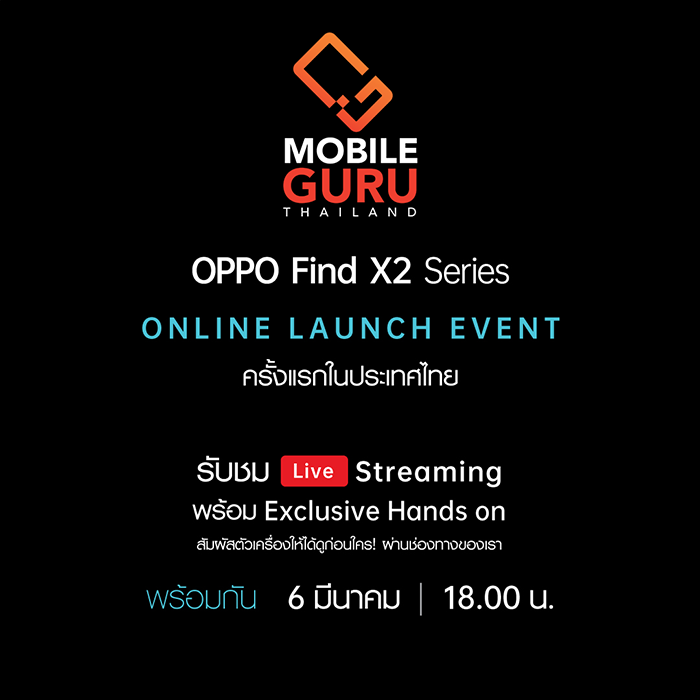 OPPO Find X2 Series ที่อัดแน่นด้วยนวัตกรรมและเทคโนโลยีระดับไฮเอนด์ โดยจะเปิดตัวผ่าน Online Live Streaming นับเป็นครั้งแรกของออปโป้ที่เปิดตัวผลิตภัณฑ์ใหม่ให้ได้รับชมพร้อมกันทั่วโลก ร่วมค้นพบนวัตกรรมขั้นสุดแห่งปีที่มาพร้อมกับเทคโนโลยีแห่งอนาคต ได้ทั้งสองช่องทาง ได้แก่