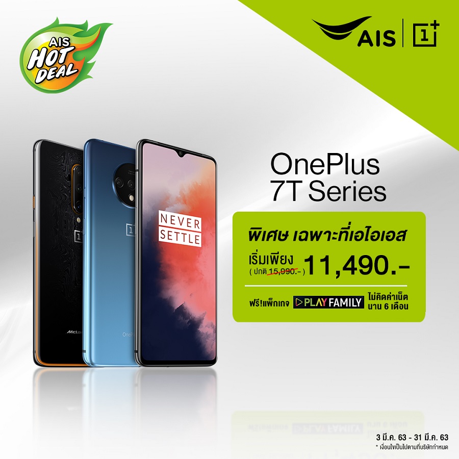 AIS ยังมีโปรโมชันสุดคุ้ม รับส่วนลดค่าเครื่องเพิ่มเมื่อซื้อ OnePlus 7T พร้อมแพ็กเกจรายเดือน AIS Hot Deal ประจำเดือนมีนาคม ค่าบริการรายเดือนเริ่มต้นเดือนละ 649 บาท ชำระค่าบริการล่วงหน้า 1,000 บาท เหลือเพียง 11,490 บาท ตั้งแต่วันที่ 3 - 31 มีนาคมนี้เท่านั้น