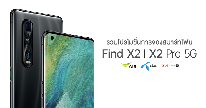 - รับส่วนลดค่าเครื่องเพิ่ม 2,000 บาท เหลือเพียง 29,990 บาท เมื่อสั่งซื้อ OPPO Find X2 Pro 5G ล่วงหน้าและสำหรับลูกค้าดีแทคที่มีอายุการใช้งาน 12 เดือนขึ้นไป ไม่ต้องชำระค่าบริการล่วงหน้า