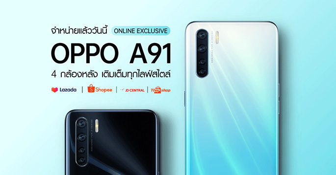 OPPO A91 สมาร์ทโฟนดีไซน์บางเฉียบ พร้อม 4 กล้องหลัง "เติมเต็มทุกไลฟ์สไตล์" พร้อมวางจำหน่ายอย่างเป็นทางการแล้ววันนี้ ในราคา 7,999 บาท ผ่านช่องทางออนไลน์หลัก 4 ช่องทาง ได้แก่ Lazada, Shopee, JD Central และ Thisshop