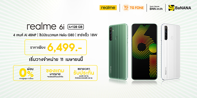 realme 6i ในวันที่ 11 เมษายนนี้ สำหรับความจุ 4GB + 128GB ในราคาเพียง 6,499 บาท ผ่านช่องทาง TG FONE และ BaNANA หรือช้อปออนไลน์ที่ BNN.in.th พร้อมโปรโมชั่นผ่อน 0% นานสูงสุด 6 เดือน และขยายระยะเวลาการรับประกันในช่วง COVID-19 อีกด้วย