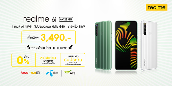พิเศษ! สำหรับลูกค้า TrueMove H, dtac และ AIS เมื่อซื้อพร้อมแพคเกจสุดคุ้มสามารถเป็นเจ้าของ realme 6i ความจุ 4GB + 128GB ในราคาเริ่มต้นเพียง 3,490 บาท พร้อมของแถมและโปรโมชั่นผ่อน 0% และขยายระยะเวลาการรับประกันในช่วง COVID-19 อีกด้วย