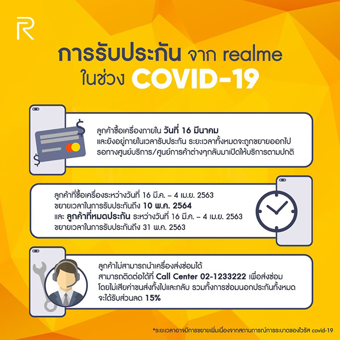 - สำหรับลูกค้าซื้อเครื่องภายในวันที่ 16 มีนาคม และยังไม่หมดประกัน ระยะเวลาทั้งหมดจะถูกขยายออกไปรอทางศูนย์บริการ/ศูนย์การค้าต่างๆกลับมาเปิดให้บริการตามปกติ