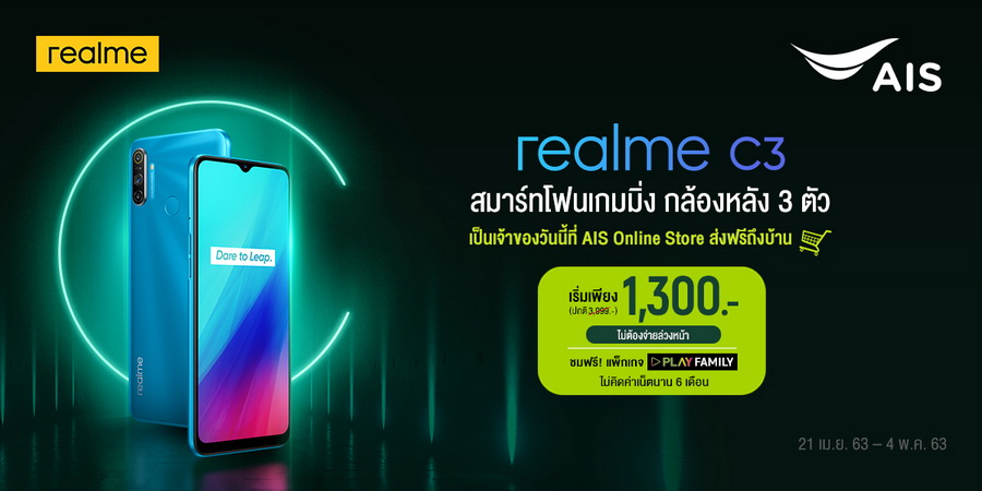 ซื้อสมาร์ทโฟน realme C3 กับ AIS ราคาพิเศษเพียง 1,300 บาท โดยไม่ต้องชำระค่าบริการล่วงหน้า พร้อมส่งฟรีถึงบ้าน