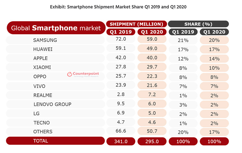 Counterpoint Research เกี่ยวกับสถิติยอดส่งออกสมาร์ทโฟนในไตรมาสที่ 1 ปี 2563 เผยว่า