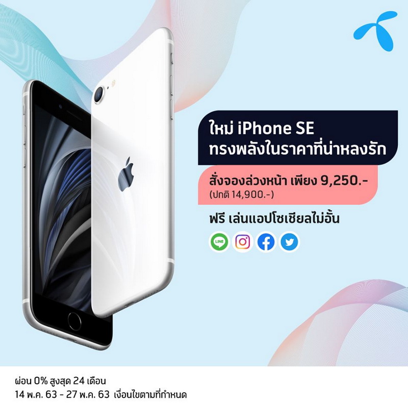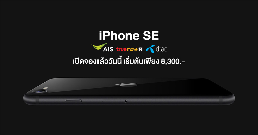 ซื้อ iPhone SE กับ AIS ราคาเริ่มต้นเพียง 8,300 บาท เมื่อซื้อเครื่องพร้อมแพ็กเกจ 4G Hot Deal XTRA สำหรับลูกค้าเปิดเบอร์ใหม่ ย้ายค่ายเบอร์เดิม เปลี่ยนจากเติมเงินเป็นรายเดือน และลูกค้าปัจจุบันในระบบรายเดือน พิเศษลูกค้าย้ายค่ายรับส่วนลดเพิ่ม 1,000 บาท