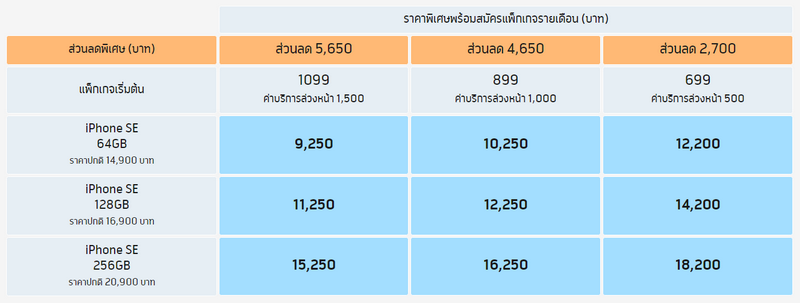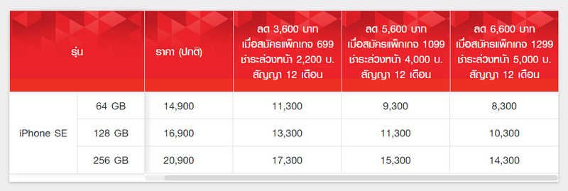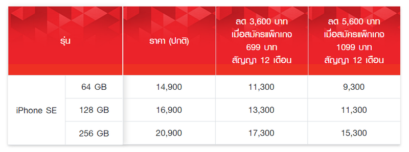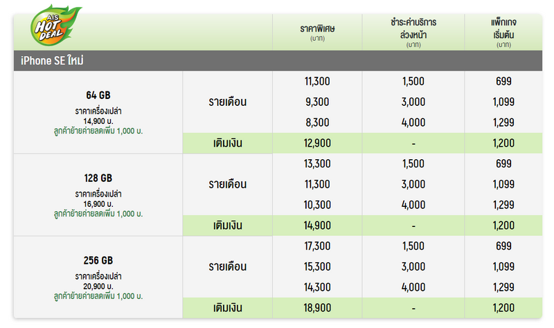 สำหรับลูกค้า AIS รายเดือน ไม่ต้องจ่ายล่วงหน้า เมื่อใช้หรือสมัครแพ็กเกจตามที่กำหนด iPhone SE 64GB ราคา 8,300 บาท, iPhone SE 128GB ราคา 10,300 บาท และ iPhone SE 256GB ราคา 14,300 บาท
