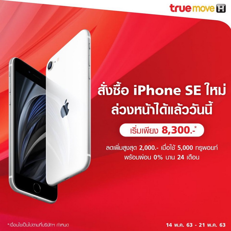 ซื้อ iPhone SE กับ TrueMove H ราคาเริ่มต้นเพียง 8,300 บาท เมื่อซื้อเครื่องพร้อมแพ็กเกจ 4G+ Extra Fun Unlimited สำหรับลูกค้าเปิดเบอร์ใหม่ ย้ายค่ายเบอร์เดิม และเปลี่ยนจากเติมเงินเป็นรายเดือน ลูกค้าปัจจุบันแบบรายเดือน (อายุการใช้งาน 90 วันขึ้นไป) ที่ไม่มีสัญญาการใช้งาน หรือสัญญาคงเหลือน้อยกว่า 90 วัน ลูกค้า ย้ายค่าย เบอร์เดิม รับส่วนลดเพิ่ม 1,000 บาท