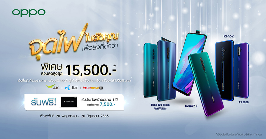 OPPO A9 2020 รับส่วนลดสูงสุด 15,500 บาท พร้อมรับฟรี! E-VIP Card รับประกันหน้าจอ 1 ปี มูลค่าสูงสุด 7,500 บาท ตั้งแต่ 20 พฤษภาคม - 20 มิถุนายน 2563 โดยรายละเอียดโปรโมชั่นของแต่ละรุ่น มีดังนี้