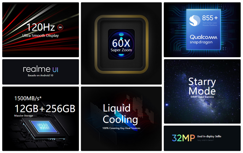 realme X3 SuperZoom มาพร้อมดีไซน์ที่ดูคล้าย realme X2 Pro หน้าจอ IPS LCD ขนาด 6.6 นิ้ว ความละเอียด Full HD+ 1080 x 2400 pixels (399 ppi) Refresh Rate 120Hz Ultra Smooth Display อัตราส่วน 20:9, กระจก Corning Gorilla Glass 5, ทำงานบน Android 10 ครอบทับด้วย Realme UI, Qualcomm Snapdragon 855+, GPU Adreno 640, RAM 12GB, ROM 256GB (UFS 3.0), Wi-Fi 802.11 a/b/g/n/ac, Bluetooth 5.0, USB Type-C, เซนเซอร์ Fingerprint (side-mounted), accelerometer, gyro, proximity, compass, แบตเตอรี่ความจุ 4,200 mAh รองรับ Fast charging 30W ชาร์จเพียง 55 นาที เต็ม 100%