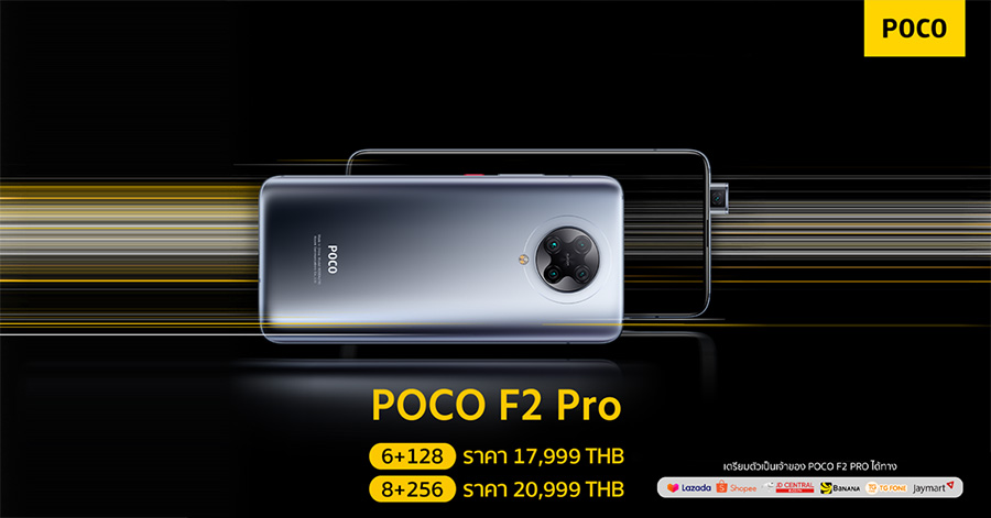 สำหรับ POCO F2 Pro รุ่นความจุ 8GB + 256GB จะวางจำหน่ายในราคา 20,999 บาท และวางจำหน่าย ณ ร้าน COM7, TG FONE, JAYMART, Mi Stores และร้านค้าที่ร่วมรายการ