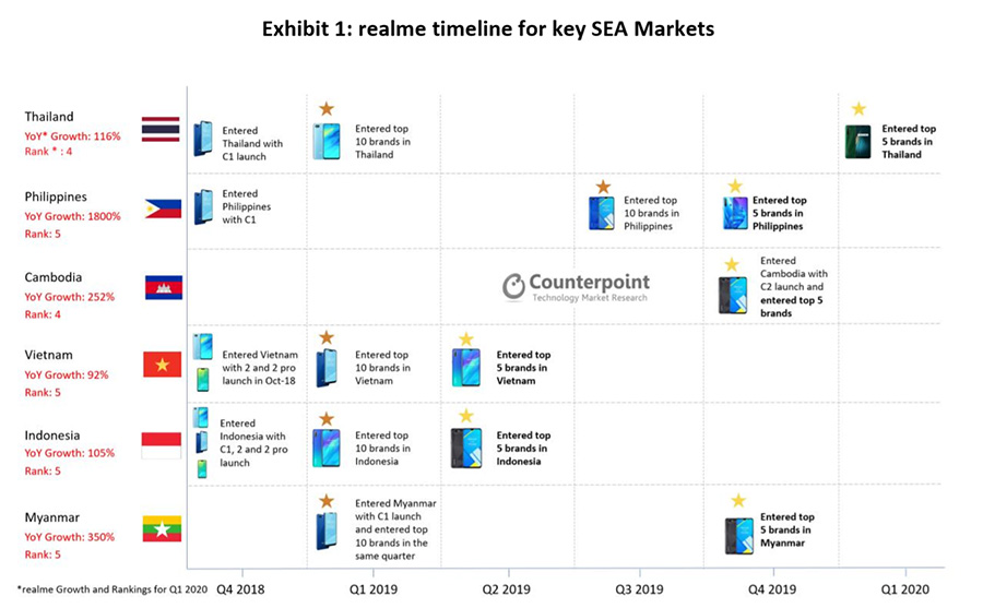 realme ครองอันดับ 5 ในตลาดสมาร์ทโฟนเอเชียตะวันออกเฉียงใต้ด้วยการเติบโต 173% เมื่อเทียบกับปีก่อน ถือเป็นแบรนด์สมาร์ทโฟนที่เติบโตเร็วที่สุดในภูมิภาค ในไตรมาสที่ 1 ปี 2563 ด้วยผลกระทบจากการระบาดของ COVID-19 ส่งผลให้ยอดการจัดส่งสมาร์ทโฟนในภูมิภาคเอเชียตะวันออกเฉียงใต้ลดลง 11% และยอดการจัดส่งสมาร์ทโฟนทั่วโลกลดลง 13% เมื่อเทียบกับไตรมาสแรกในปี 2562 ซึ่ง