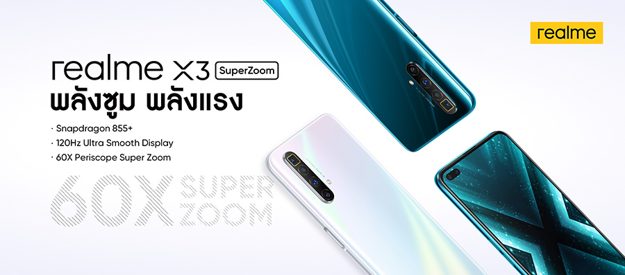 realme X3 SuperZoom สมาร์ทโฟนเรือธงรุ่นแรกที่มาพร้อมเลนส์ Periscope พลังซูม 60 เท่า มีการอัพเกรดด้วยประสิทธิภาพการประมวลผลเร็วแรงทรงพลังด้วยชิปเซ็ต Snapdragon 855+ และหน้าจอลื่นไหลด้วยอัตรา Refresh Rate 120Hz พร้อมทั้งผลิตภัณฑ์ AIoT ล่าสุดอย่าง