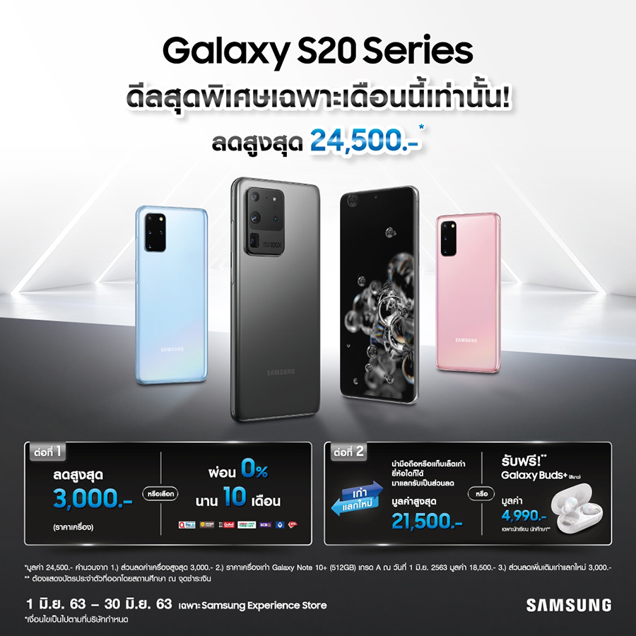 Samsung Galaxy S20 Series มอบส่วนลดแบบจัดเต็มถึง 2 ต่อ ต่อที่ 1 รับทันทีส่วนลด 3,000 บาท ต่อที่ 2 รับส่วนลดเพิ่มเมื่อนำเครื่องเก่ามาแลกใหม่ รวมมูลค่าสูงสุดถึง 24,500 บาท เฉพาะที่ซัมซุง เอ็กซ์พีเรียนซ์ สโตร์ ทุกสาขา จนถึงสิ้นเดือนมิ.ย. นี้เท่านั้น