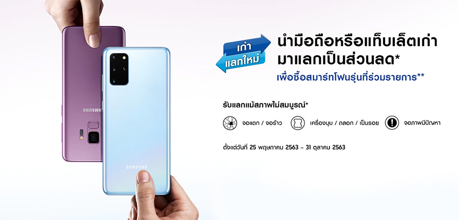 ไม่เพียงเท่านั้น ซัมซุงยังมอบความพิเศษกับโปรแกรม "เก่าแลกใหม่" โดยสามารถนำมือถือหรือแท็บเล็ตเก่ายี่ห้อใดรุ่นใดก็ได้ที่ร่วมรายการ มาแลกรับส่วนลดสูงสุดถึง 18,500 บาท* เมื่อซื้อสมาร์ทโฟนหรือแท็บเล็ตกาแลคซี่เครื่องใหม่ ไม่ว่าจะเป็น Galaxy Tab, Galaxy Note Series, Galaxy S Series, และ Galaxy A Series ตั้งแต่วันนี้จนถึง 31 สิงหาคม 2563 งานนี้กาแลคซี่แฟนห้ามพลาด!