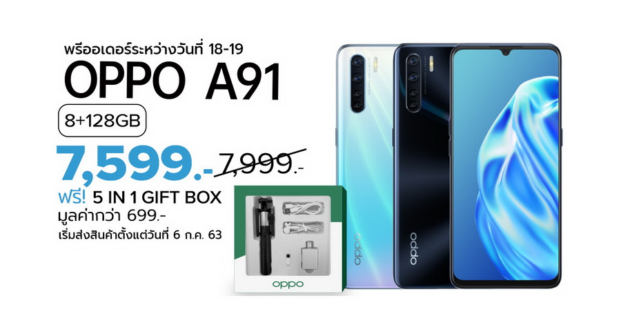 - OPPO A91 ผ่าน OPPO Official Store ลดเหลือเพียง 7,599 บาท จากปกติ 7,999 บาท พร้อมรับฟรี! 5 IN 1 Gift Box มูลค่า 699 บาท หรือเมื่อซื้อ OPPO A91 คู่กับหูฟัง OPPO Enco M31 ลดเหลือเพียง 8,699 บาท จากปกติ 9,198 บาท (สินค้าจะได้รับวันที่ 6 ก.ค. 63)