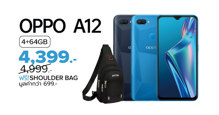 - ซื้อ OPPO A12 รุ่น RAM 4GB/ROM 64GB ลดเหลือเพียง 4,399 บาท จากปกติ 4,999 บาท พร้อมรับฟรี! Shoulder Bag มูลค่า 699 บาท