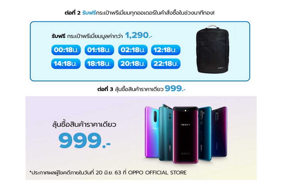 ซื้อสินค้า OPPO ผ่าน OPPO Official Store ในช่วงเวลา 0.18, 1.18, 2.18, 12.18, 14.18, 18.18, 20.18 และ 22.18 รับฟรี! กระเป๋าพรีเมียม มูลค่า 1,290 บาท