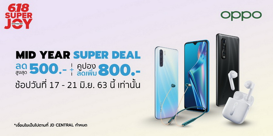 สมาร์ทโฟน OPPO ลดสูงสุด 50% กับแคมเปญ 6.18 SUPER JOY 17 - 21 มิ.ย. 63 ที่ JD Central