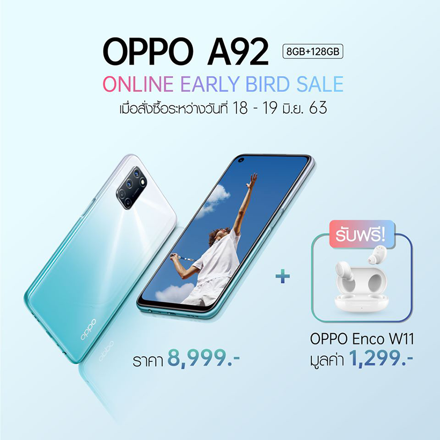 โปรโมชั่น Online Early Bird Sale เมื่อซื้อ OPPO A92 ผ่านช่องทางออนไลน์เท่านั้น ได้แก่ OPPO Brand Shop ออนไลน์ และตัวแทนจำหน่ายออนไลน์ที่ร่วมรายการ ภายในวันที่ 18 - 19 มิถุนายน 2563 รับฟรี หูฟัง OPPO Enco W11 จำนวนจำกัด!