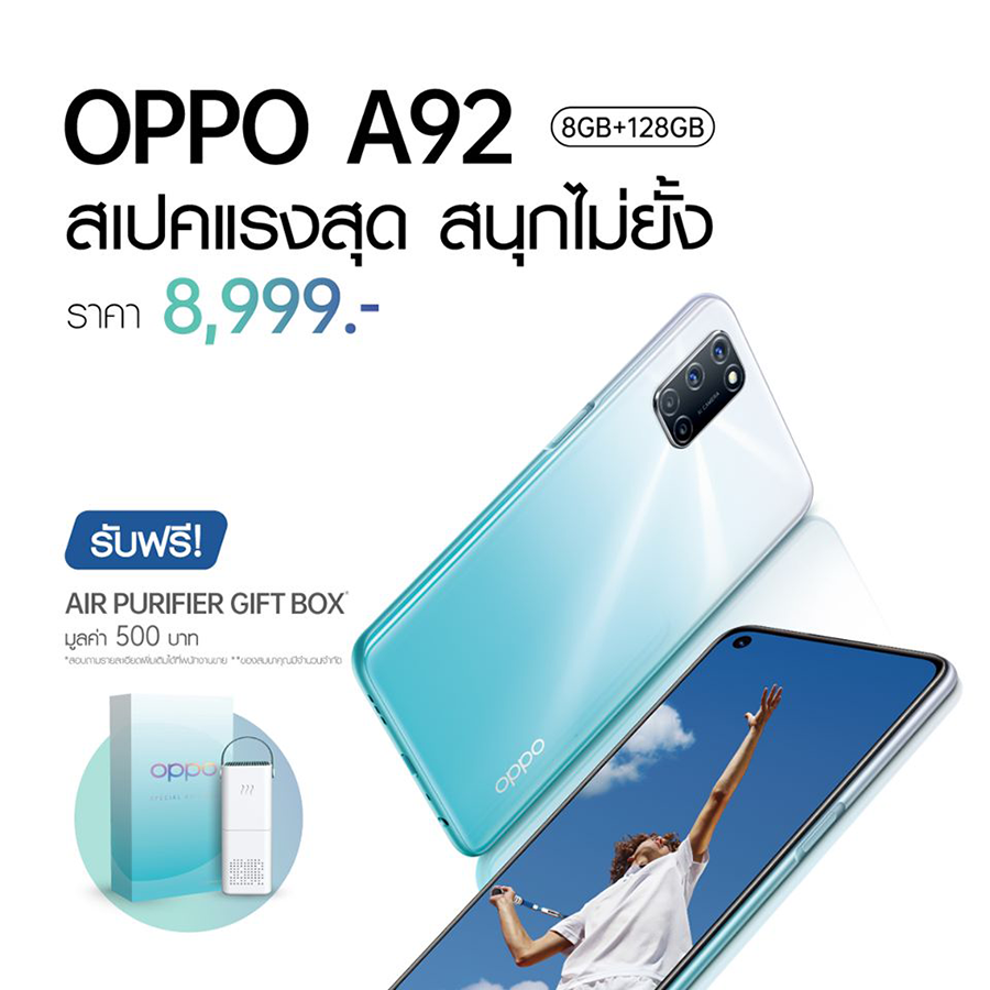 OPPO A92 วางจำหน่ายวันแรกในวันที่ 20 มิถุนายน 2563 เป็นต้นไป พร้อมโปรโมชั่นเมื่อซื้อ OPPO A92 รับฟรี! Air Purifier Gift Box โดยของแถมมีจำนวนจำกัด หรือ โปรโมชั่นแพ็คคู่สุดคุ้ม เมื่อซื้อ OPPO A92 คู่กับ OPPO Enco W11 รับส่วนลดหูฟังทันที เหลือเพียง 999 บาท จากราคาปกติ 1,299 บาท ตั้งแต่ 20 มิถุนายน - 31 สิงหาคม 2563 ของมีจำนวนจำกัด!