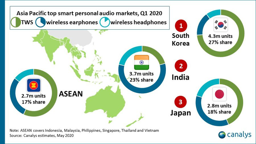 Canalys เผยข้อมูลสถิติด้านการตลาดของผลิตภัณฑ์ในกลุ่มหูฟังไร้สายในภูมิภาคอาเซียนพบว่า มีอัตราการเติบโตอย่างรวดเร็ว ซึ่งในไตรมาสแรกของปี 2020 ที่ผ่านมา หูฟังไร้สายจากสามแบรนด์ดังอย่าง Apple, Samsung และ Xiaomi สามารถครองส่วนแบ่งทางการตลาดเป็นแบรนด์สามอันดับแรก (Top 3) ในประเทศด้านบนของภูมิภาคนี้ที่ประกอบด้วย ไทย, สิงคโปร์, มาเลเซีย, ฟิลิปปินส์ และอินโดนิเซีย ไว้ได้ทั้งหมด