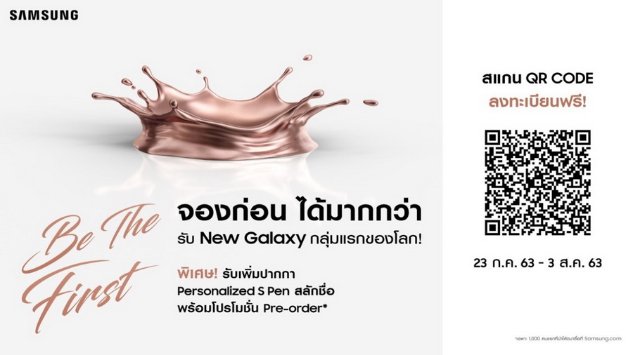 สาวก Samsung Galaxy Note Series ไม่ควรพลาด กับโค้งสุดท้ายที่จะได้เป็นเจ้าจอง New Galaxy กลุ่มแรกของโลก ก่อนที่จะเผยโฉมพร้อมกันครั้งแรก 5 สิงหาคมนี้ กับแคมเปญสุดพิเศษ Be The First พิเศษ! รับเพิ่ม ปากกา Personalized S Pen ที่สลักชื่อของคุณบน S Pen แท่งเดียวในโลกแบบสุดเอ็กซ์คลูซีฟ เพียงกรอ กชื่อที่ต้องการสลักล่วงหน้าหลังจากที่ลงทะเบียนฟรีเรียบร้อยแล้ว พร้อมโปรโมชั่น Pre-order ผู้ที่สนใจลงทะเบียนได้ฟรีเพื่อจองสิทธิ์ ตั้งแต่วันนี้ - 3 สิงหาคม 2563