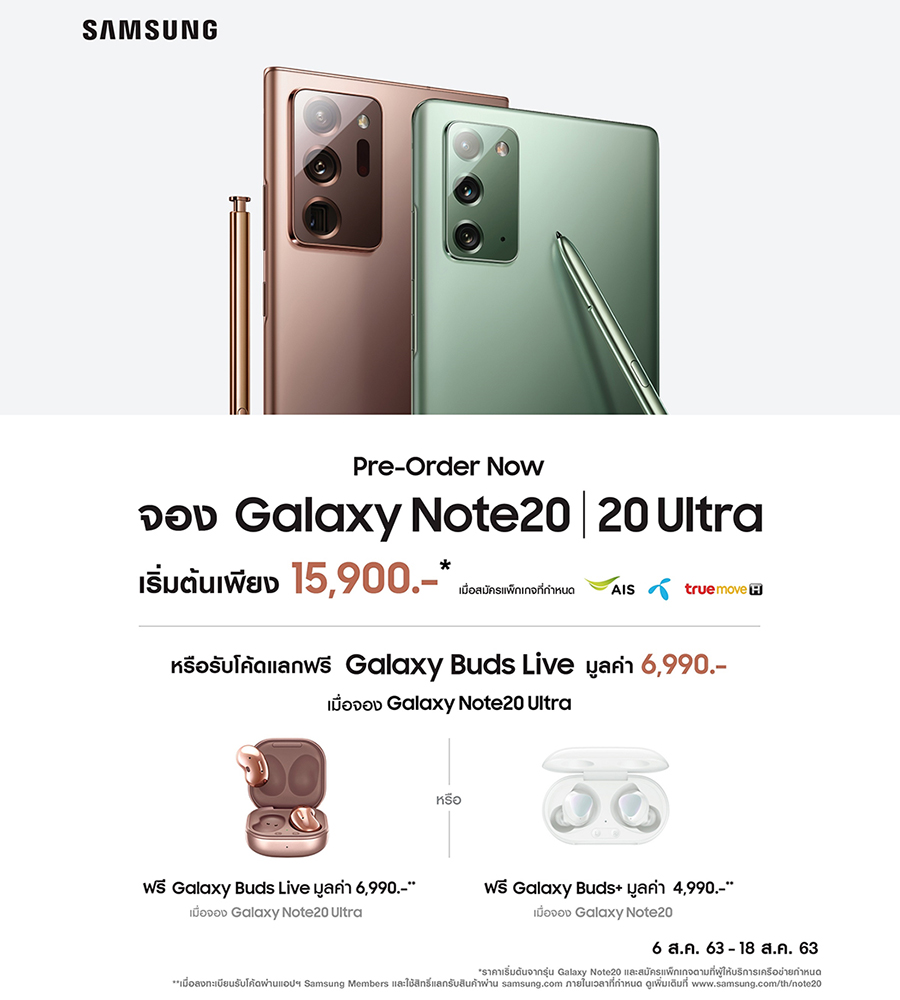 - รับโค้ดแลกฟรีหูฟังบลูทูธรุ่นใหม่ล่าสุด Galaxy Buds Live มูลค่า 6,990 บาท เมื่อจอง Galaxy Note20 Ultra หรือ Galaxy Buds+ มูลค่า 4,990 บาท เมื่อจอง Galaxy Note20 ผ่าน Samsung Experience Store, samsung.com และร้านค้าที่ร่วมรายการ หรือ