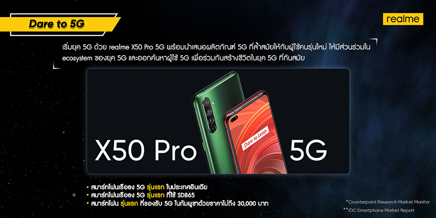 realme มุ่งมั่นที่จะมอบผลิตภัณฑ์ 5G โดยได้เริ่มต้นจากการเปิดตัว realme X50 Pro 5G ซึ่ง realme ได้เปิดตัวสมาร์ทโฟนเรือธง 5G รุ่นแรกอย่างเป็นทางการแล้วที่ประเทศอินเดีย ไทย และกัมพูชา