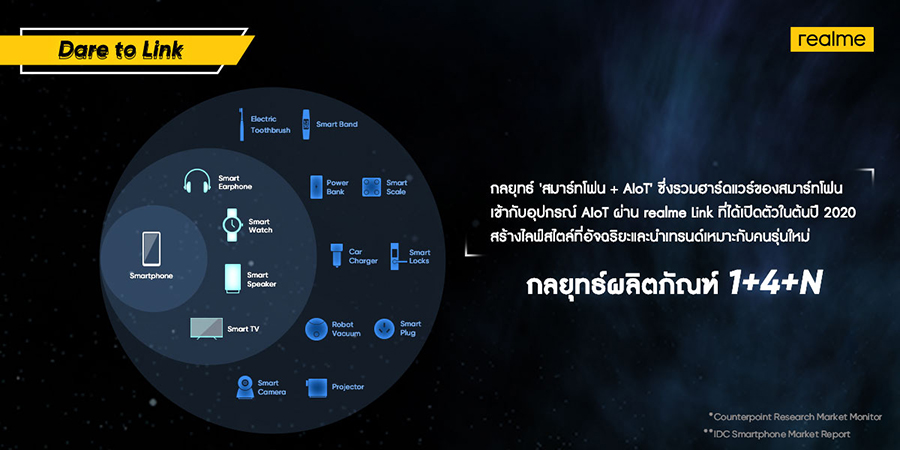 realme วางกลยุทธ์ AIoT ตามหลักเกณฑ์ "1+4+N" ซึ่ง 1 หมายถึงผลิตภัณฑ์หลักนั่นคือ "สมาร์ทโฟน" ที่ทำงานร่วมกับ 4 กลุ่มผลิตภัณฑ์ไลฟ์สไตล์หลักที่ประกอบด้วย ลำโพง หูฟัง ทีวี และนาฬิกาอัจฉริยะ และ "N" แสดงถึงความมุ่งมั่นในการนำเสนอผลิตภัณฑ์ AIoT และอุปกรณ์เสริมต่างๆ อีกมากมาย