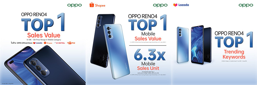 สำหรับช่องทางออนไลน์ OPPO Reno4 ยังได้รับยอดขายอันดับ 1 ในแคมเปญ Shopee Super Brand Day ผ่านทางช่องทาง Shopee โดยมียอดขายในด้านจำนวนเครื่องมากกว่า 6.3 เท่า ของสมาร์ทโฟนที่มีช่วงราคา 10,000 - 12,000 บาท และยอดการค้นหาอันดับ 1 ในหมวดสมาร์ทโฟนในช่องทาง Lazada เมื่อวันที่ 27 กรกฎาคม - 2 สิงหาคม 2563 โดยผลตอบรับจากลูกค้าในช่องทาง E-commerce มีผลตอบรับที่ดีเช่นกัน ไม่ว่าจะเป็นดีไซน์ของตัวเครื่องที่มีความเบา จับกระชับมือ หรือในด้านการถ่ายภาพที่สวยชัดครบจบในเครื่องเดียว พร้อมฟีเจอร์กล้องที่ตอบโจทย์คนรุ่นใหม่ได้เป็นอย่างดี