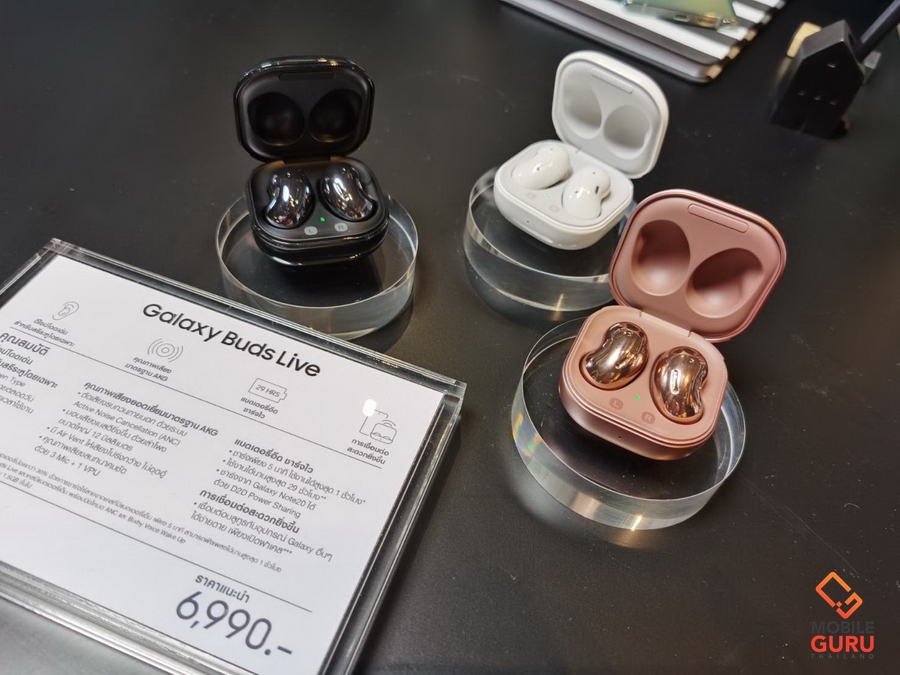 Galaxy Buds Live หูฟังไร้สายรุ่นใหม่ในรูปทรงสุดไอคอนิกที่ออกแบบให้โค้งรับสรีระ มาพร้อมที่สุดแห่งคุณภาพเสียงจาก AKG มอบพลังเสียงนุ่มลึกมีมิติด้วยลำโพงขนาด 12 มม.และ Bass Duct พร้อมทั้งลำโพง 3 ตัว และเทคโนโลยี Voice Pick-up Unit (VPU) ช่วยให้การสนทนาคมชัดราวกับอยู่ในที่เดียวกัน อีกทั้งยังเป็นหูฟังแบบเปิดที่มีฟังก์ชั่น Active Noise Cancellation (ANC) ช่วยตัดเสียงรบกวนภายนอก แต่ยังคงไว้ให้ผู้ใส่ได้รับรู้ถึงเหตุการณ์สำคัญที่เกิดขึ้นรอบด้าน ราคา 6,990 บาท