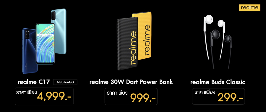 - realme 30W Dart Charge Power Bank มาในราคาเพียง 999 บาท และหูฟัง realme Buds Classic มาในราคาเพียง 299 บาท วางจำหน่ายแล้ววันนี้ที่ realme Brand Shop ทุกสาขา สามารถมาจับจองเป็นเจ้าของ สมาร์ทโฟนรวมทั้งอุปกรณ์เสริมและผลิตภัณฑ์ AIoT แบบครบครันได้แล้ววันนี้ที่ realme Brand Shop และตัวแทนจำหน่ายทั่วประเทศ สามารถติดตามรายละเอียดเพิ่มเติมได้ที่ https://www.facebook.com/realmeTH