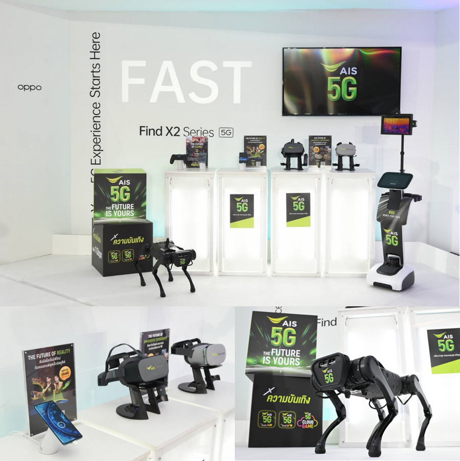AIS นำเสนออุปกรณ์ AR, VR และ Cloud Gaming รวมถึงหุ่นยนต์ที่เป็นนวัตกรรมที่โชว์ศักยภาพของ AIS 5G ที่จะเข้ามาช่วยให้การใช้ชีวิตของเราสะดวกสบาย และปลอดภัยมากยิ่งขึ้น ไม่ว่าจะเป็นหุ่นยนต์น้องสุนัข K9 ที่เป็นสัตว์เลี้ยงอัจฉริยะ และหุ่นยนต์ ROC (Robot of Care) ที่เข้ามาช่วยทางด้านการแพทย์และสาธารณสุข โดยหุ่นสามารถช่วยคัดกรอง ตรวจวัดอุณหภูมิ ให้บริการเจลแอลกอฮอลล์ เพื่อลดการสัมผัส และป้องกันการแพร่ระบาดของ COVID-19 ได้อีกด้วย ภายใน AIS 5G Experience Zone ที่จะมาขยายขอบเขตความสนุกได้อย่างไร้ขีดจำกัด เพื่อเป็นการตอกย้ำถึงความเป็นผู้นำด้านเทคโนโลยี 5G อีกด้วย