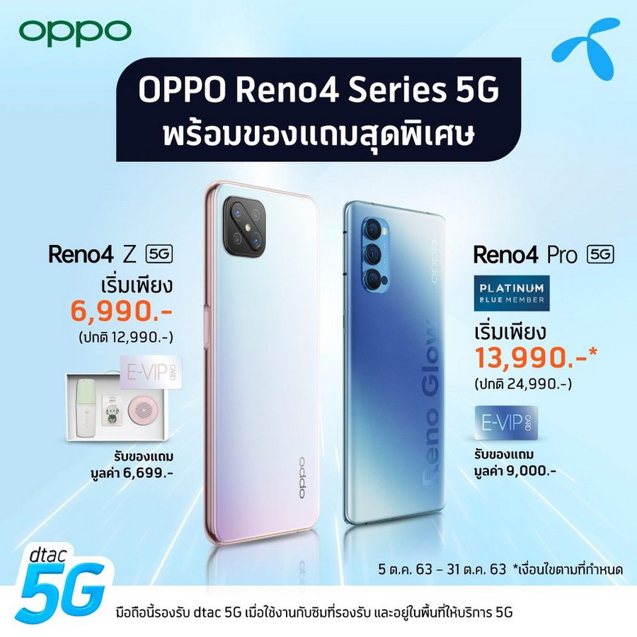 พิเศษสุดสำหรับลูกค้า ดีแทค แพลตินั่มบลูเมมเบอร์ (Platinum Blue Member) ที่มีอายุการใช้งาน 12 เดือนขึ้นไป รับส่วนลดค่าเครื่องเพิ่ม 2,000 บาท (เงื่อนไขเป็นไปตามที่บริษัทฯ กำหนด) พร้อมให้คุณเป็นเจ้าของสมาร์ทโฟน 5G ซีรีส์ จาก OPPO ได้แล้วที่ศูนย์บริการดีแทคทั่วประเทศ หรือ dtac online store ระหว่างวันนี้ - 9 พฤศจิกายน 2563 ดูรายละเอียดโปรโมชั่นเพิ่มเติมได้ที่ https://bit.ly/33wmOiJ