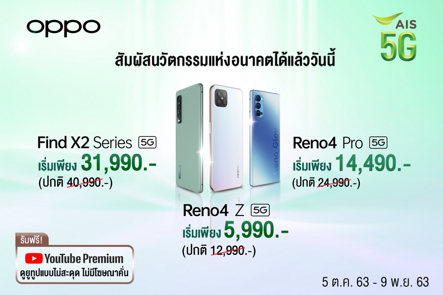 สามารถเป็นเจ้าของสมาร์ทโฟน 5G ซีรีส์ จาก OPPO พร้อมรับโปรโมชั่นสุดคุ้มได้แล้วที่ AIS Shop ทุกสาขา หรือ ทางเว็บไซต์ https://m.ais.co.th/7LHQEewC8 ตั้งแต่วันนี้ - 9 พฤศจิกายน 2563