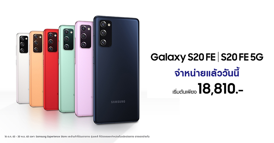 ใครที่กำลังมองหาสมาร์ทโฟนรุ่นใหม่ที่ให้คุณได้ทำในสิ่งที่ชอบ สไตล์ที่ใช่ รวมทั้งบ่งบอกความเป็นตัวเองได้ผ่านสีสันที่หลากหลาย จัดเลย! กับ Samsung Galaxy S20 FE ทั้ง 2 รุ่นได้แก่ Galaxy S20 FE และ Galaxy S20 FE 5G ที่เปิดวางจำหน่ายอย่างเป็นทางการทั่วประเทศแล้วตั้งแต่วันนี้ เป็นต้นไป พร้อมโปรโมชันสุดพิเศษ ในราคาเริ่มต้นเพียง 18,810 บาท ตั้งแต่วันที่ 16 ตุลาคม - 30 พฤศจิกายนนี้เท่านั้น ที่ Samsung Experience Store หรือสามารถสั่งซื้อได้ทาง Samsung.com และร้านค้าที่ให้บริการ