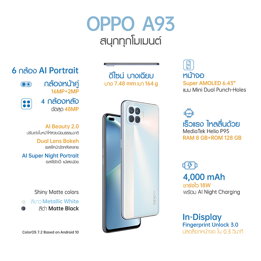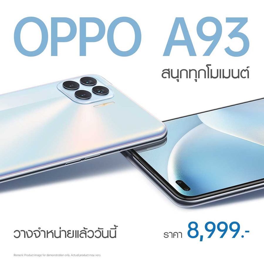 OPPO A93 ภายใต้สโลแกน "สนุกทุกโมเมนต์" วางจำหน่ายแล้ววันนี้ โดยมีให้เลือก 2 สี คือ สีขาว Metallic White และสีดำ Matte Black ในราคา 8,999 บาท ที่ OPPO Brand Shop และตัวแทนจำหน่ายทั่วประเทศ
